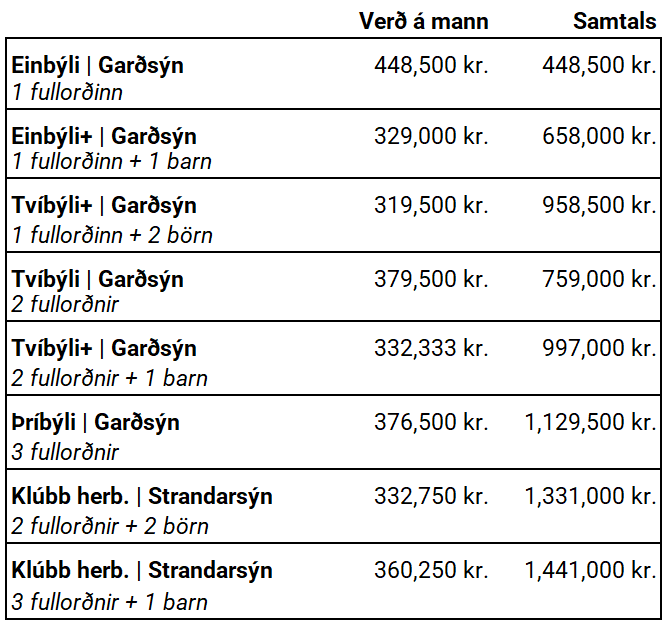 Ungabarn (undir tveggja ára): 20.000kr.- (sitja með foreldrum í flugvél og sofa í sama rúmi eða fá ungbarnarúm)